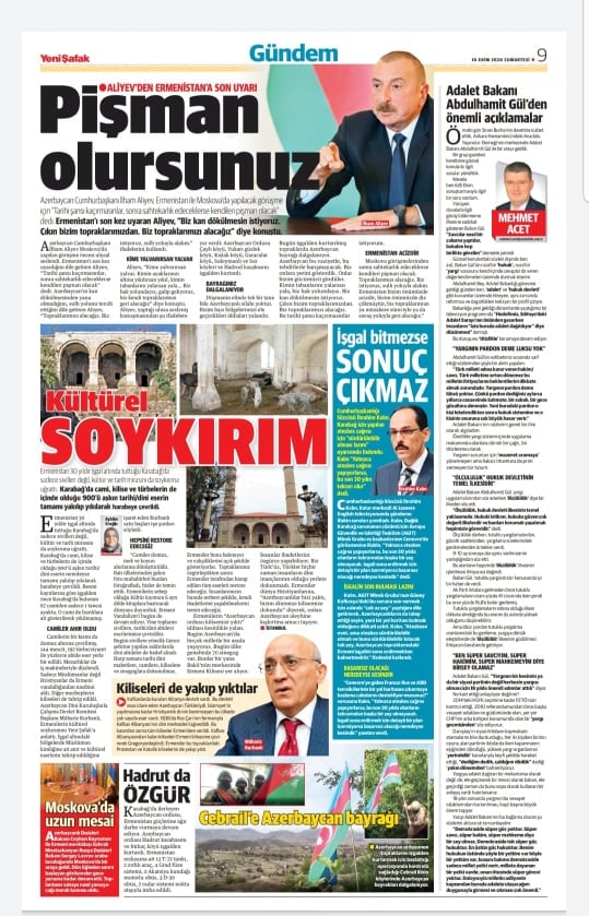 Dini Qurumlarla İş üzrə Dövlət Komitəsinin sədri Mübariz Qurbanlı Türkiyənin "Yeni Şafak" qəzetinə işğal olunmuş torpaqlarımızda erməni vandalizminə məruz qalan mədəni, tarixi, dini abidələrimizlə bağlı açıqlama verib. Fotofaktların da yer aldığı “Kültürel soykırım” başlıqlı yazıda Komitə sədri bildirib ki, Azərbaycanın işğal olunmuş ərazilərində yerləşən maddi-mədəniyyət nümunələrini, o cümlədən tarixi-dini abidələri məhv etmək Ermənistanın təcavüzkar siyasətinin tərkib hissələrindən biridir. Ermənistan Azərbaycan xalqına məxsus tarixi-dini abidələrə qarşı təcavüzünü müxtəlif istiqamətlərdə aparır. Belə ki, milli mənsubiyyəti və dini ənənələri özündə əks etdirən abidələrin tamamilə dağıdılmış və ya erməniləşdirilməsinə, özgələşdirilib dəyişdirilməsinə cəhdlər edilmişdir. İşğal altındakı müsəlman dini kimliyinə aid olan abidələr, o cümlədən digər mədəniyyət nümunələri dağıdılmaqla yanaşı, həm də təhqir olunur. Ermənilərin səbəb olduğu vandalizm aktlarının dünya ictimaiyyətinə çatdırılması üçün Dini Qurumlarla İş üzrə Dövlət Komitəsi tərəfindən 6 ayrı dildə kitabların çap edildiyini vurğulayan Mübariz Qurbanlı erməni mənbələrinin guya Azərbaycan Ordusunun Şuşada kilsəyə raket zərbəsi endirməsi haqda yalan məlumatlara da münasibət bildirib. Diqqətə çatdırıb ki, Azərbaycan tarixən milli-mənəvi cəhətdən zəngin, müxtəlif dil, din və mədəniyyətlərin sərbəst şəkildə inkişaf etdiyi məkanlardan biridir. Bakının mərkəzində Azərbaycan hökuməti tərəfindən bərpa edilmiş erməni kilsəsi var. Bu ermənilərin münaqişəyə dini çalar vermək cəhdidir.